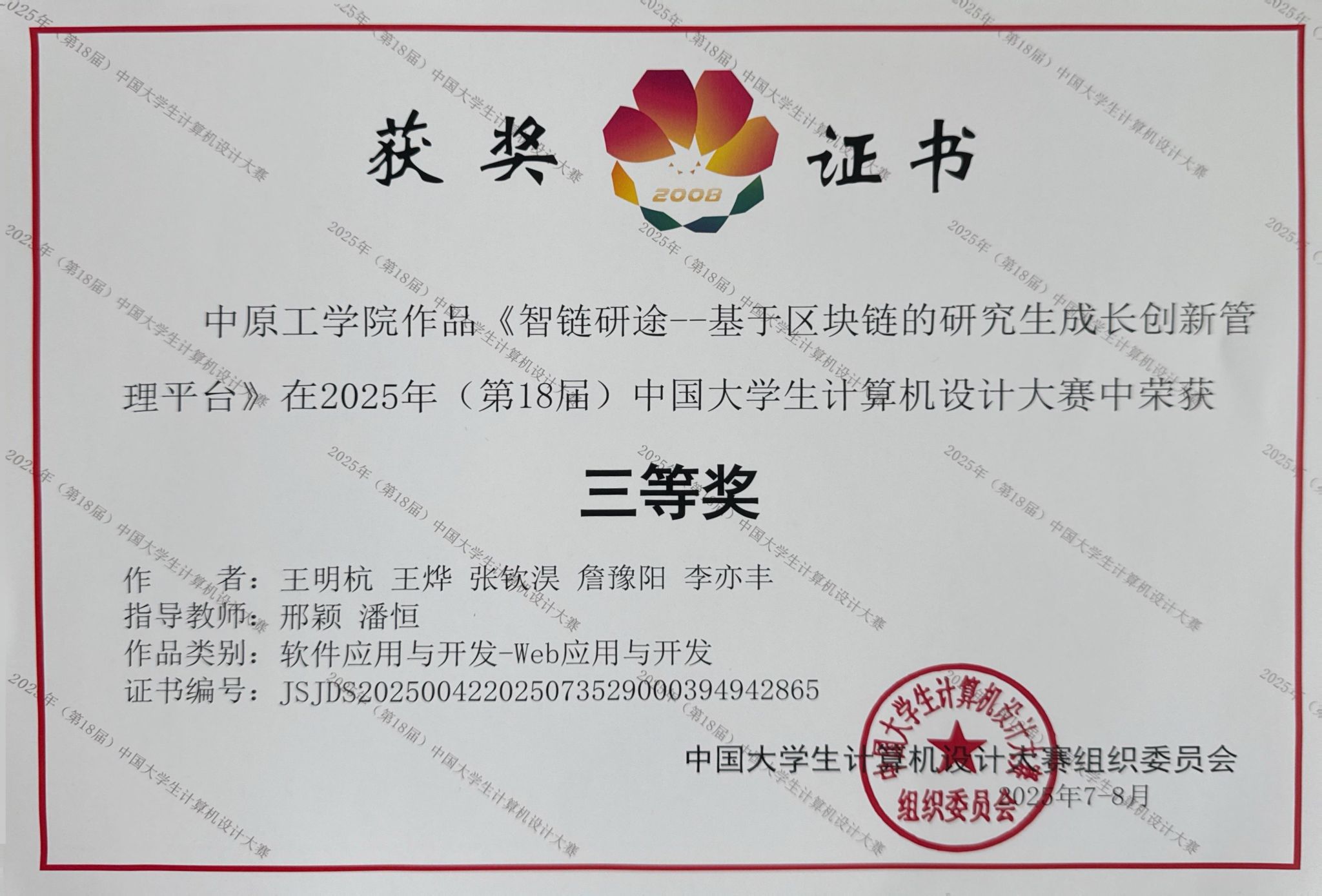 参赛团队凭借作品《智链研途——基于区块链的研究生成长创新管理平台》在“软件与应用开发”类别中表现优异,荣获全国三等奖。